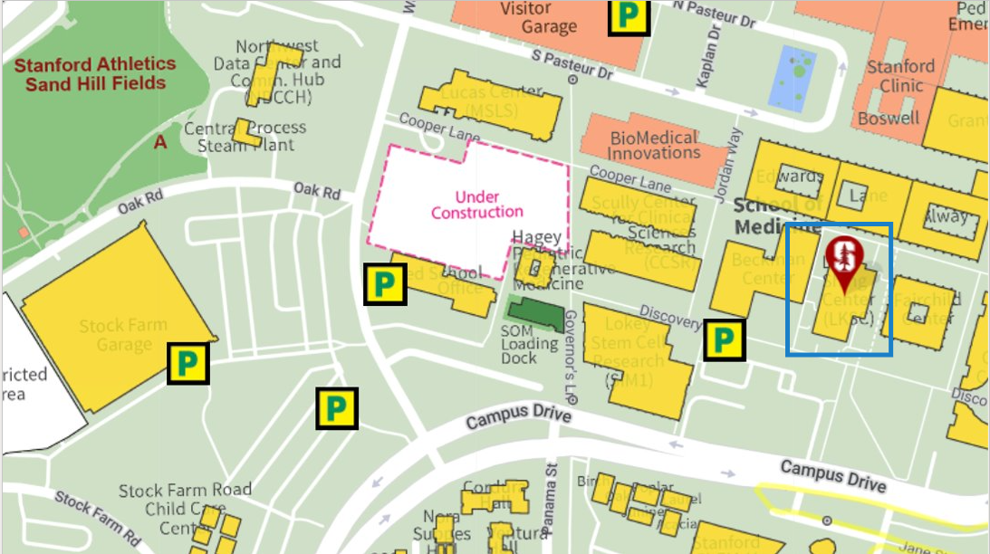Li Ka Shing Learning and Knowledge Center is boxed in blue in the above map and "P" shows where parking is available. For information about payment options for visitor parking, please refer to here: https://transportation.stanford.edu/how-purchase-visitor-parking